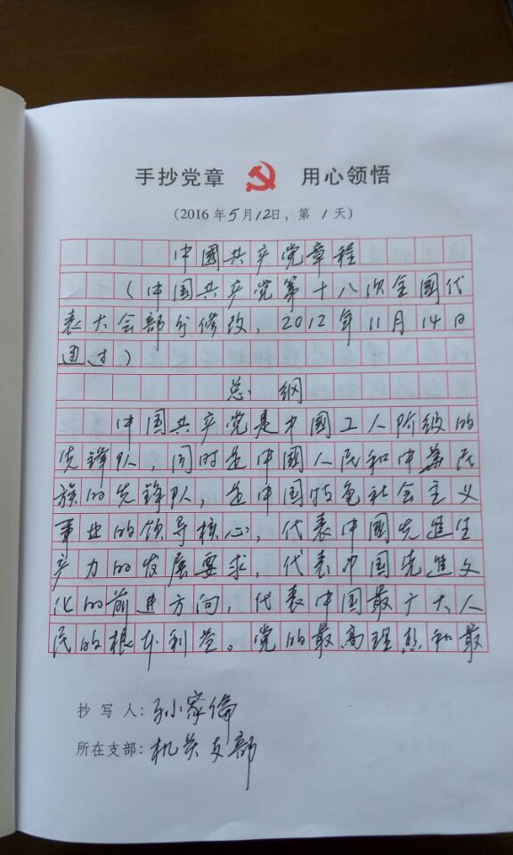 公司黨委統(tǒng)一印制了專門的抄寫本,要求每個(gè)在職黨員按每天抄寫150字的速度用100天抄寫完畢。做到每天堅(jiān)持,在手抄黨章的過程中,逐句逐字研讀黨章,自覺尊崇黨章,遵守黨章,維護(hù)黨章,進(jìn)一步增強(qiáng)黨性觀念,做合格黨員。