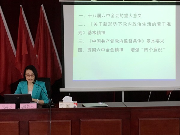 吳梅芳教授從全面從嚴治黨的高度,深刻闡述了黨的十八屆六中全會的重大意義,緊緊圍繞加強和規(guī)范黨內(nèi)政治生活的重要性等四個方面對《關(guān)于新形勢下黨內(nèi)政治生活的若干準則》進行了重點解讀,并就《中國共產(chǎn)黨黨內(nèi)監(jiān)督條例》修訂的內(nèi)容和特點等方面作了提煉分析,對學(xué)習(xí)貫徹黨的十八屆六中全會精神、不斷強化“四個意識”提出了具體要求。她的報告系統(tǒng)全面,層次分明,站位高、解讀準、接地氣,既有理論深度,又有生動實例,對廣大黨員干部學(xué)習(xí)領(lǐng)會和掌握黨的十八屆六中全會精神,全面提升企業(yè)黨建工作水平具有重要的指導(dǎo)意義和促進作用。