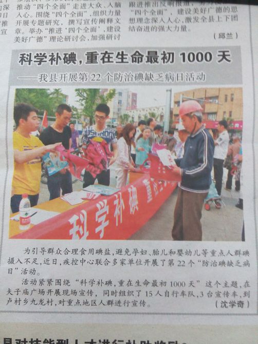 《今日廣德報(bào)》:科學(xué)補(bǔ)碘,重在生命最初100天 ——我縣開(kāi)展第22個(gè)防治碘缺乏病日活動(dòng)