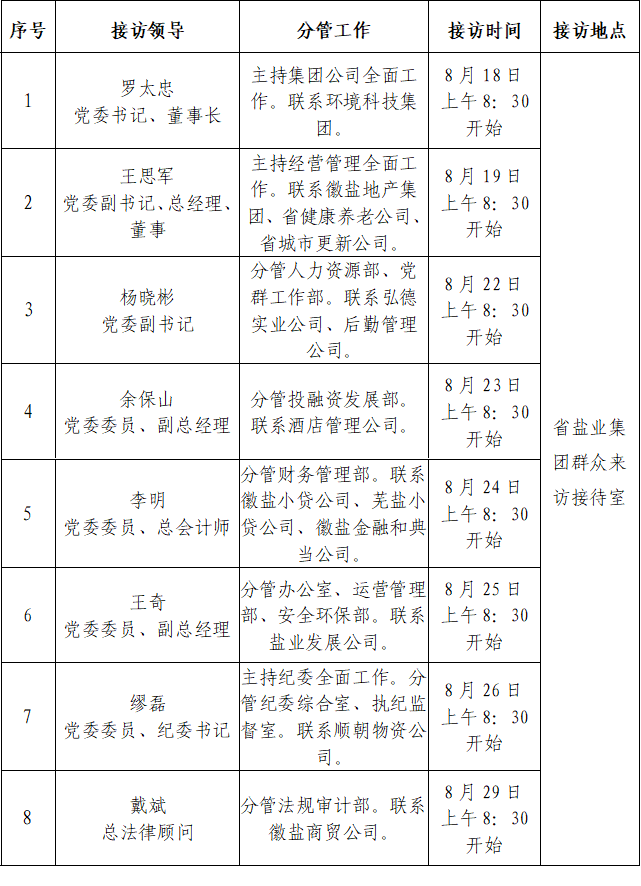 根據工作安排,現就省鹽業(yè)集團領導班子成員8月份接待省鹽業(yè)系統職工群眾來訪安排公示如下: