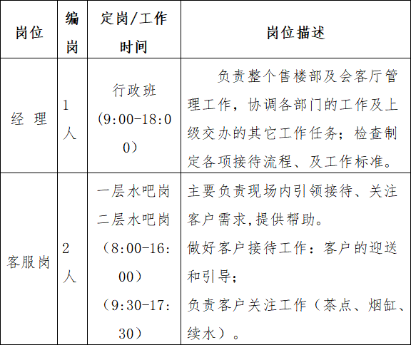 (3)客服崗:選派的客服人員必須經(jīng)過專業(yè)技能培訓(xùn),身體健康,品行良好,無違法違紀(jì)犯罪前科,具有初中以上文化程度,年齡在21至45周歲、身高1.65米以上。對(duì)現(xiàn)場(chǎng)的客戶接待服務(wù)工作有一定的意識(shí)。