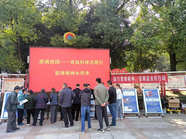 活動(dòng)現(xiàn)場,通過擺放宣傳展架、低鈉鹽、生活用鹽展臺(tái)、懸掛“踐行雷鋒精神,安徽鹽業(yè)在行動(dòng)”橫幅、大屏幕投放主題標(biāo)語等,營造了濃厚的活動(dòng)氛圍。志愿服務(wù)隊(duì)向社區(qū)居民免費(fèi)發(fā)放宣傳單頁、控鹽量勺、綠色低鈉鹽等物品,為居民如何健康用鹽答疑解惑,宣傳科學(xué)補(bǔ)碘知識(shí),倡導(dǎo)低鈉飲食消費(fèi)理念,贏得了社區(qū)居民廣泛好評(píng)。