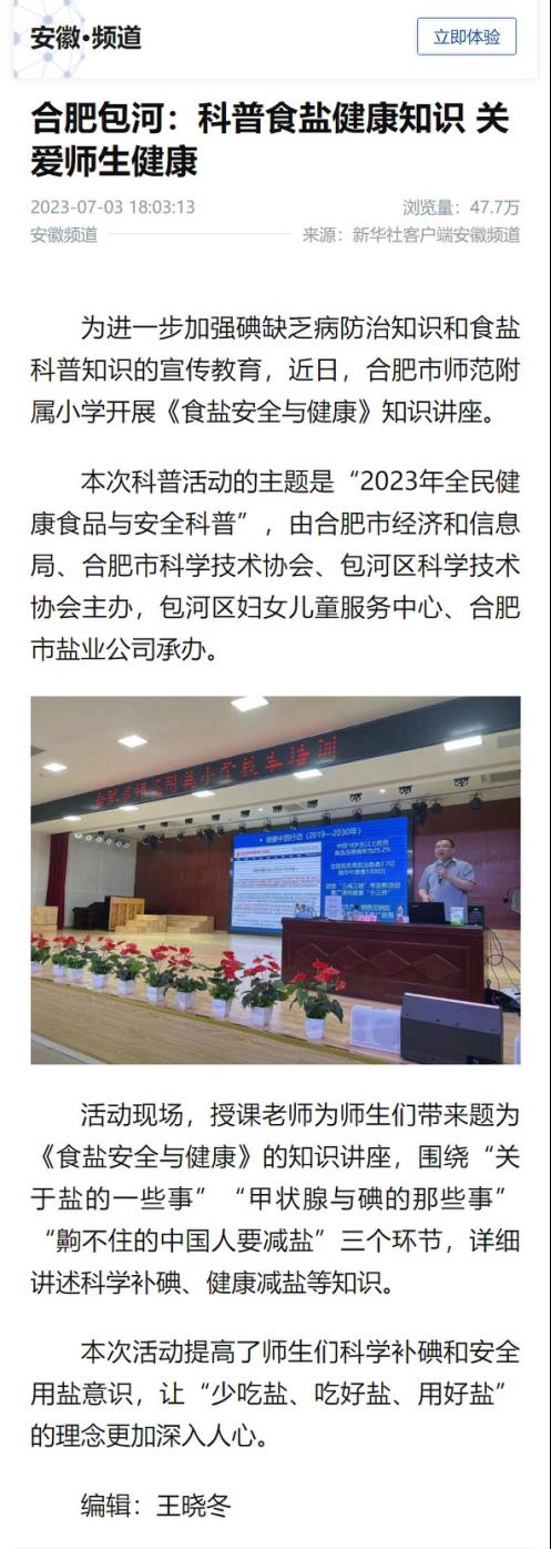 為切實做好黨的二十大精神宣傳貫徹工作,在習(xí)近平新時代中國特色社會主義思想指引下 ,進(jìn)一步樹牢以人民健康為中心的發(fā)展思想,合肥鹽業(yè)在合肥市師范附屬小學(xué)開展食鹽科普活動,為全校200余名師生普及科學(xué)補(bǔ)碘、健康減鹽知識,關(guān)愛師生健康,推廣中鹽低鈉鹽,助力健康中國建設(shè),食鹽健康科普活動得到新華社客戶端安徽頻道關(guān)注報道,截至發(fā)稿日總瀏覽量達(dá)47.7萬次。