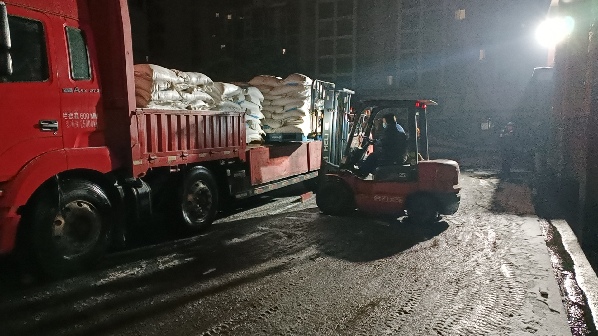 公司領(lǐng)導(dǎo)班子親赴倉(cāng)儲(chǔ)配送一線指揮調(diào)度,全市一市五縣鹽業(yè)干部職工眾志成城抗冰雪,頂著風(fēng)雪嚴(yán)寒,冒著雨雪和刺骨的寒風(fēng)奮戰(zhàn)在保供一線。截至2月4日下午,合肥鹽業(yè)共出動(dòng)配送車輛200臺(tái)次、配送人員100余人次、累計(jì)發(fā)出融雪鹽1500余噸,為清除全市各大公共交通道路積雪提供了有力保障。同時(shí),將倉(cāng)庫內(nèi)過期及破損小包裝鹽品拆袋裝換,為此次保供任務(wù)轉(zhuǎn)化融雪鹽品近20噸。4日晚上11點(diǎn)臨時(shí)接到市政部門緊急用鹽,公司搬運(yùn)人員在已連續(xù)作戰(zhàn)48小時(shí)的情況下,仍第一時(shí)間從家中趕至公司,奮戰(zhàn)在融雪鹽保供一線。