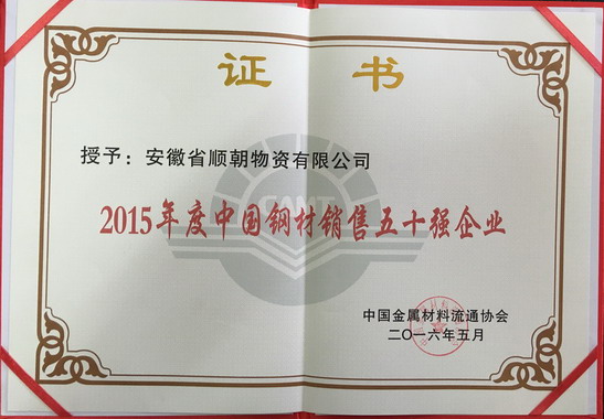 2016年5月27日,第三屆中國鋼鐵產(chǎn)業(yè)企業(yè)家峰會在山東省濱州市隆重開幕,本次峰會由中國金屬材料流通協(xié)會和濱州市博興縣人民政府聯(lián)合主辦,來自中國鋼鐵工業(yè)協(xié)會、中國施工企業(yè)管理協(xié)會、中國汽車工業(yè)協(xié)會等上下游行業(yè)協(xié)會領導、鋼鐵生產(chǎn)、流通、終端用戶等全產(chǎn)業(yè)鏈企業(yè)家近500人出席。會上,安徽順朝第三次蟬聯(lián)中國金屬材料流通協(xié)會授予的“中國鋼材銷售五十強企業(yè)”稱號。